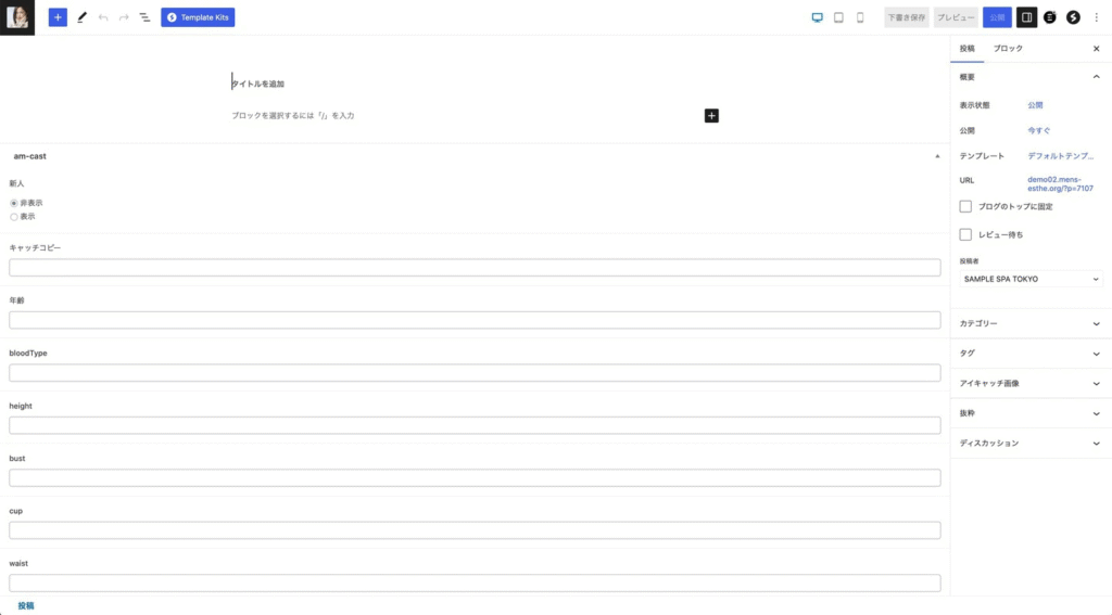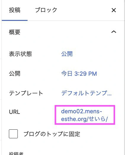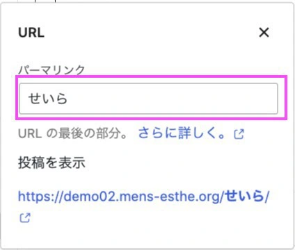 URLが日本語のままになっています。運営上は問題ありませんが、URLが日本語のままですと、ブラウザによっては長い英語になります。SEO面でも不利ですし、後の項目で説明がありますが、写メ日記の登録時に不便になりますので、日本語から英語に直した方がオススメです。