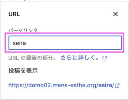 パーマリンクの下の箇所のこの場合でしたら、「せいら」を消してください。