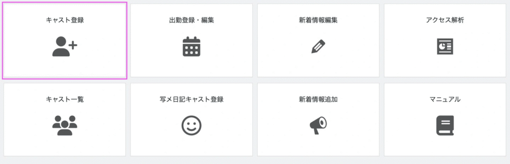 1.ダッシュボードの【キャスト登録】または、キャストメニューの【新規追加】をクリック