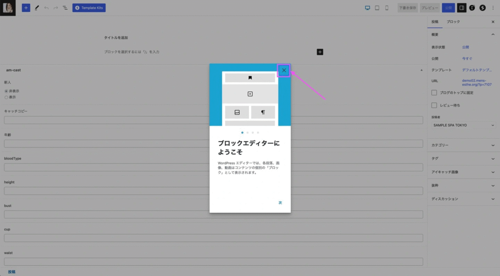 ※ブロックエディターへようこそと表示された場合は✕をクリックします。