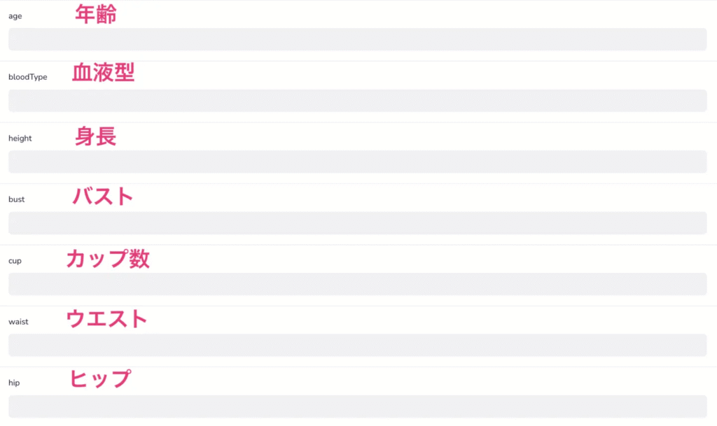 年齢、血液型、身長、バスト、カップ、ウエスト、ヒップを入力します。