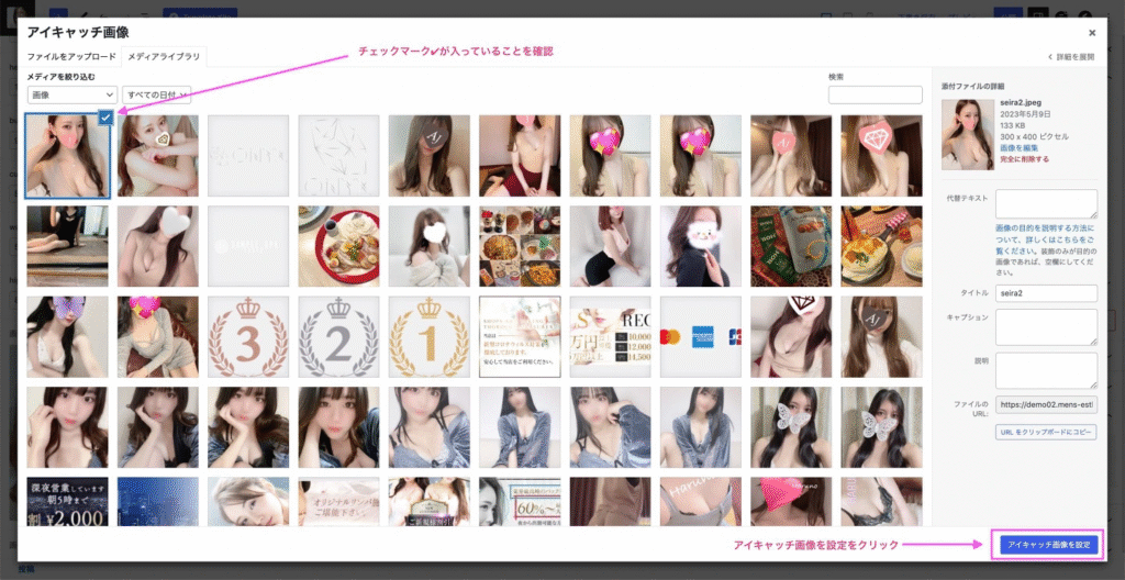 アップロードしたデータ(画像)に青色のチェックマーク✅が付いているのを確認して、右下の【アイキャッチ画像を設定】をクリック。