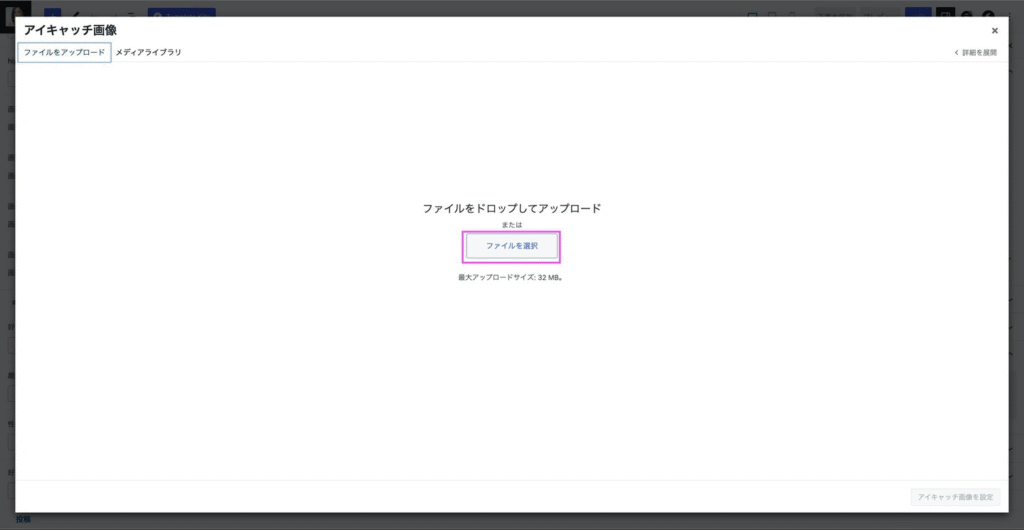 メディアライブラリが開くので左側の【ファイルをアップロード】をクリックします。